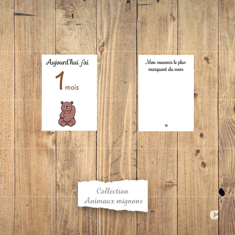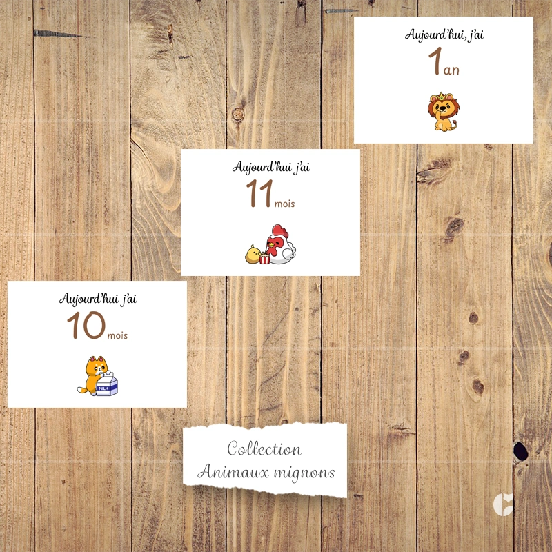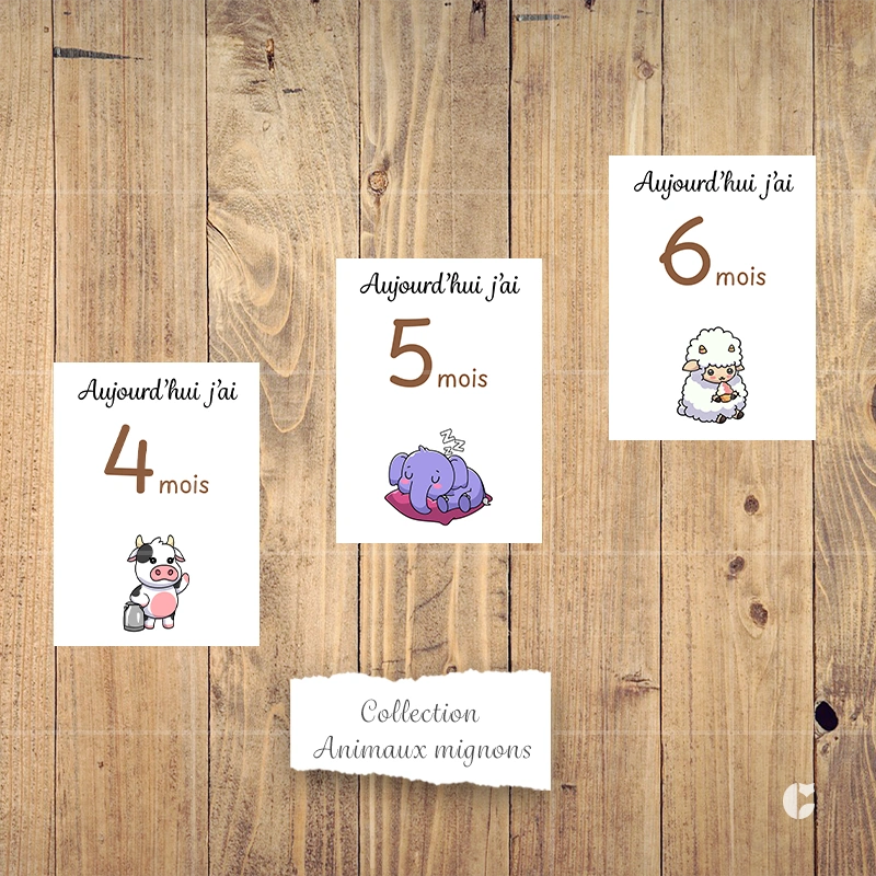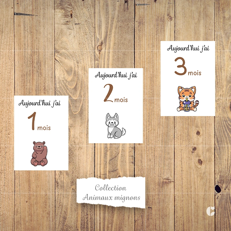 Une adorable collection de 13 cartes étapes mensuelles bébé sur le thème “Animaux Mignons” pour immortaliser la première année de votre tout-petit.